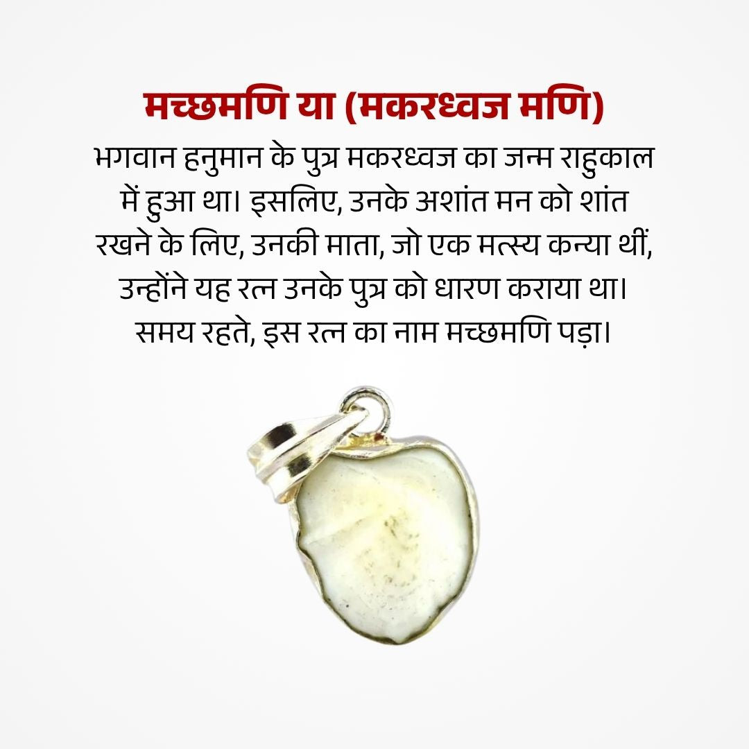 Machh Mani, also known as Makaradhwaja Mani, is a rare and precious divine gem connected with the story of Lord Hanuman’s son, Makaradhwaja, who was born during the Rahukaal period. To bring peace and stability to his son’s restless mind, his mother — a celestial mermaid — gifted him this sacred gem. Since then, this powerful stone has been known as Machh Mani, symbolizing divine protection, courage, and spiritual balance.